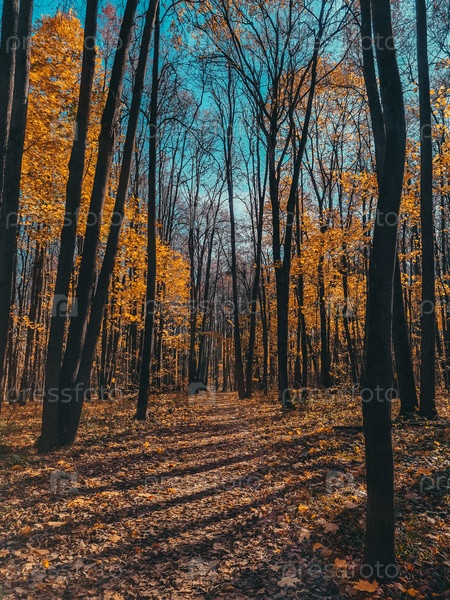 Ярко-желтый осенний лес с множеством листьев