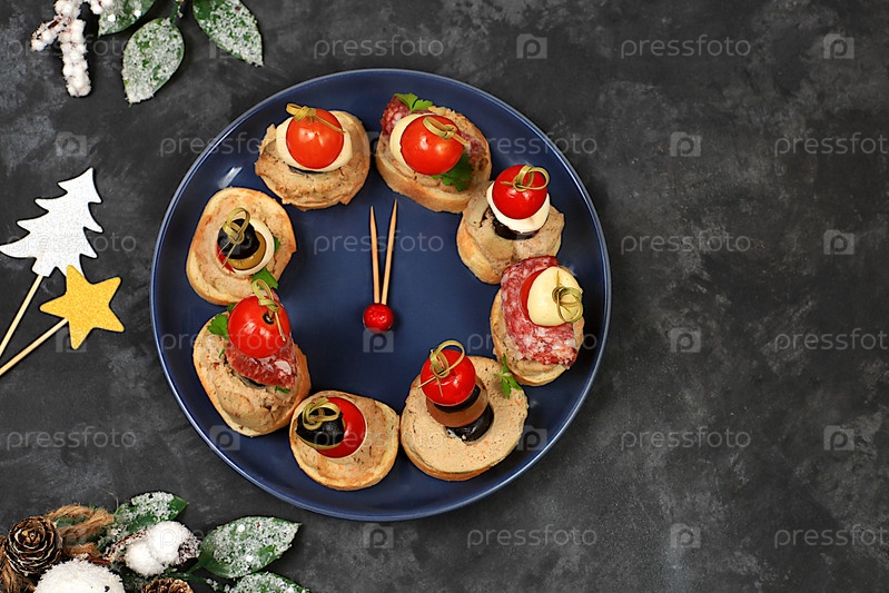 Рождественские и новогодние блюда, набор закусок для праздничного стола. Тарелка с канапе в виде часов из помидоров, паштета, сыра моцарелла, салями, оливок, черных оливок и винограда на заднем плане,