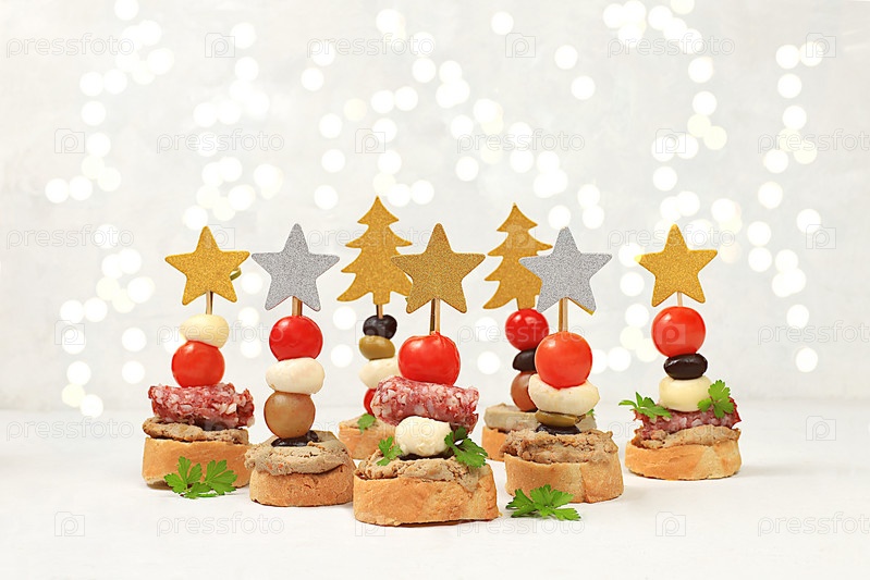 Рождественские и новогодние блюда, набор закусок для праздничного стола. Канапе из помидоров, паштета, сыра моцарелла, салями, оливок, черных оливок и винограда на мраморном столе, выборочный фокус