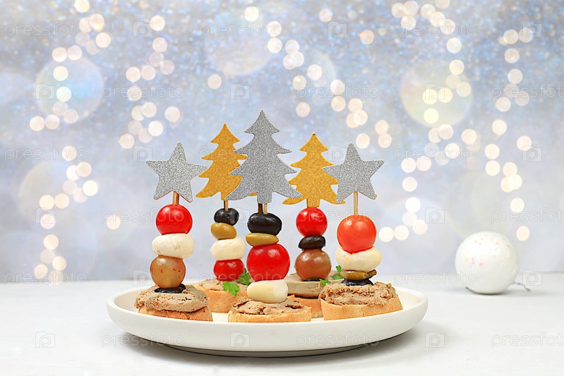 Рождественские и новогодние блюда, набор закусок для праздничного стола. Канапе из помидоров, паштета, сыра моцарелла, винограда, оливок, черных оливок и винограда на мраморном столе, выборочный фокус