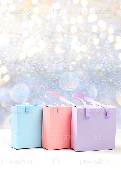 Праздничные подарочные коробки и пакеты на фоне боке с местом для текста, новогодней распродажей и концепцией покупок, черная пятница, рекламный баннер для магазина и экрана,