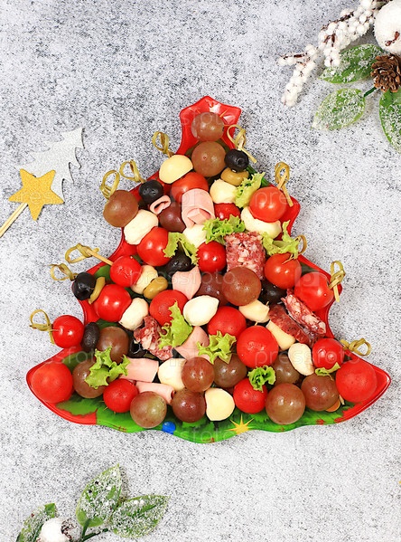 Рождественские и новогодние блюда, набор закусок для праздничного стола. Тарелка с канадками в елочку из помидоров, паштета, сыра моцарелла, салями, оливок, черных оливок и винограда на бетонном столе,