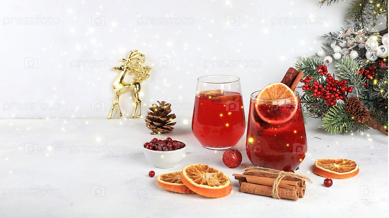Рождественский алкогольный или безалкогольный коктейль с клюквой и специями корицы, согревающий зимний напиток в холодное время года, рождественский праздничный грог, зимняя композиция, избирательный фокус