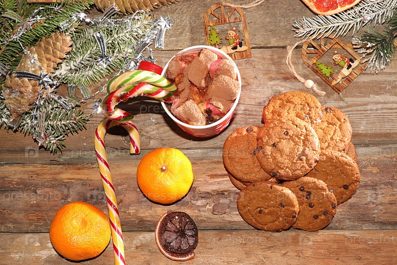 Рождественский и новогодний фон с елками, какао с зефиром и овсяным печеньем на старом деревянном фоне, вид сверху, плоская планировка. Новогодняя открытка для поздравлений, выборочный фокус, баннер,