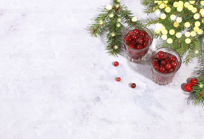Крепкие алкогольные коктейли из водки с клюквой, глинтвейн с корицей и специями, согревающий зимний напиток, концепция бара, рождественский праздничный грог, зимняя композиция с украшениями, место для текста