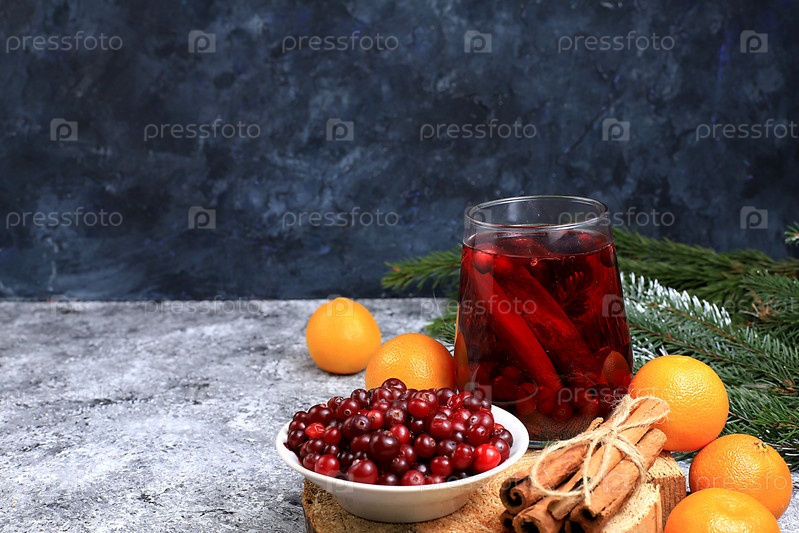 Крепкий алкогольный или безалкогольный коктейль со специями клюквы и корицы, согревающий зимний напиток в холодное время года, рождественский праздничный грог, зимняя композиция, избирательный фокус