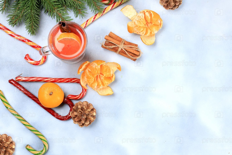 Рождественский горячий глинтвейн или грог с лимоном и корицей на праздничном столе. Зимняя композиция с еловыми ветками, мандаринами, сладостями, новогодним фоном, концепцией диеты и похудания, местом для текста, плоской планировкой