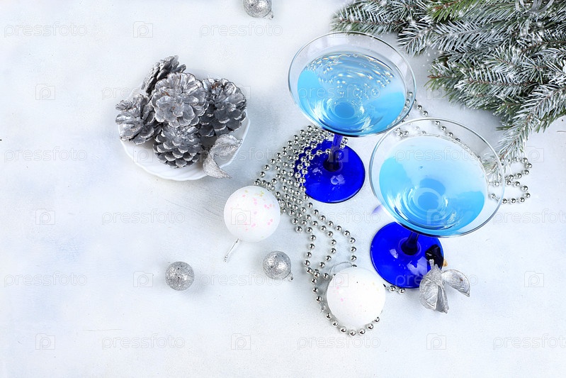 Синий алкогольный коктейль с лимонадом, шампанским или мартини в бокалах на праздничном рождественском столе с еловыми ветками и украшениями, концепция бара, алкогольные напитки на вечеринке, избирательный фокус