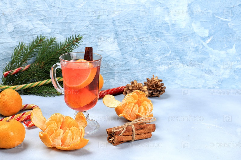 Рождественский горячий глинтвейн или грог с лимоном и корицей на праздничном столе. Зимняя композиция с еловыми ветками, мандаринами, сладостями, новогодним фоном, диетой и концепцией похудания, выборочный фокус