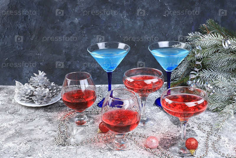 Розовый и синий алкогольный коктейль с лимонадом, шампанским или мартини в бокалах на праздничном рождественском столе с еловыми ветками и украшениями, концепция бара, спиртные напитки на вечеринке, избирательный фокус
