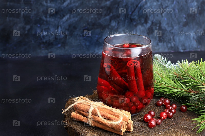 Крепкий алкогольный или безалкогольный коктейль со специями из клюквы и корицы, согревающий зимний напиток в холодное время года, рождественский праздничный грог, зимняя композиция, избирательный фокус