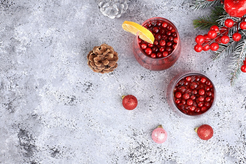Крепкий алкогольный или безалкогольный коктейль со специями из клюквы и корицы, согревающий зимний напиток в холодное время года, рождественский праздничный грог, зимняя композиция, избирательный фокус