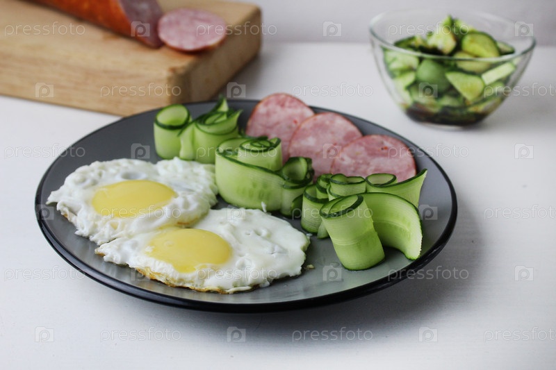 Яичница-застрак, яичница, колбаса, салат, огурцы на трале, вид сбоку сверху. Традиционный англо-американский завтрак. Первое блюдо. Польза правильного питания Яичный день. Блюда из яиц