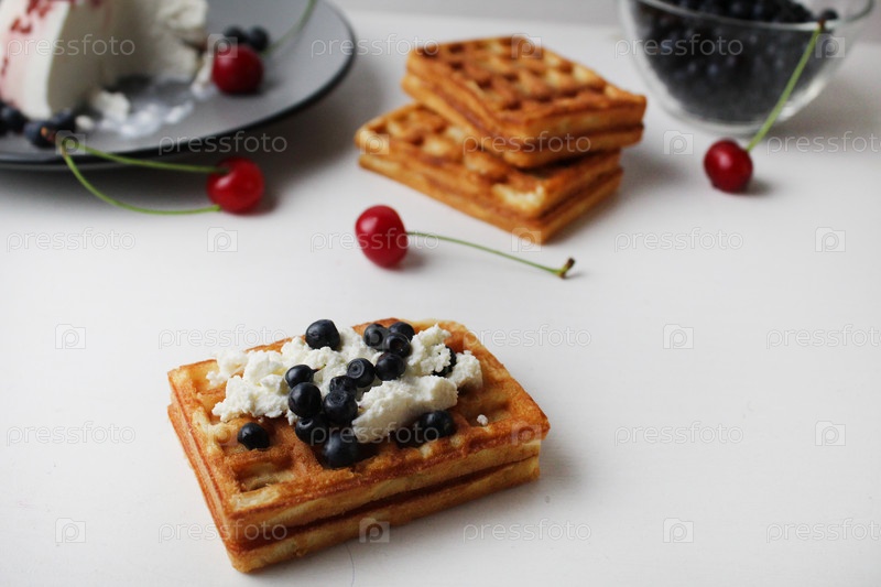 Завтрак полезный с творогом и ягодами. Бельгийские мягкие вафли с творожной черникой и вишней на белом фоне стола. Здоровая еда, вкусный завтрак, полдник, обед