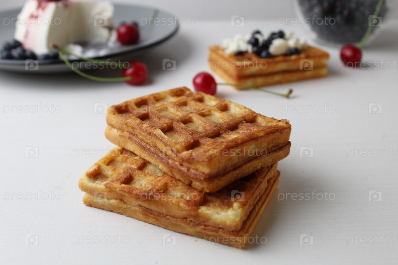 Завтрак вкусная закуска две мягкие бельгийские вафли лежат друг на друге рядом с черникой, вишневым сыром, творогом с местом для текста и копировальным пространством