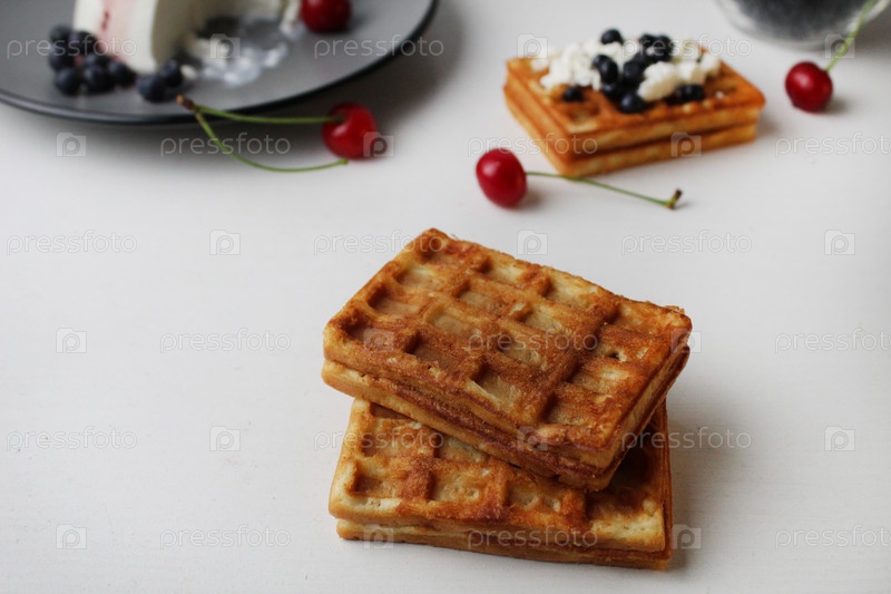 Завтрак вкусная закуска две мягкие бельгийские вафли лежат друг на друге рядом с черникой, вишневым сыром, творогом с местом для текста и копировальным пространством