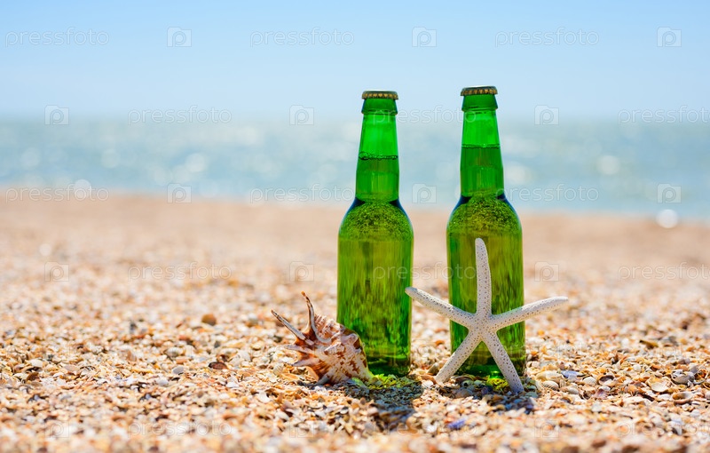 Отдых на море в тропическом месте. Две бутылки пива на пляже с ракушкой и морской звездой в солнечный день