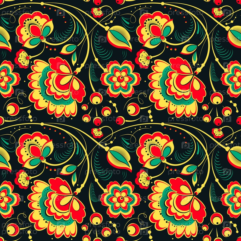 Цветочный векторный бесшовный узор в славянском стиле, хохлома