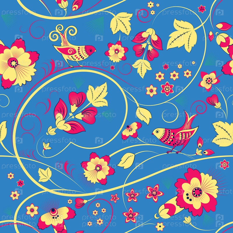 Векторный цветочный бесшовный узор с птицами на синем фоне