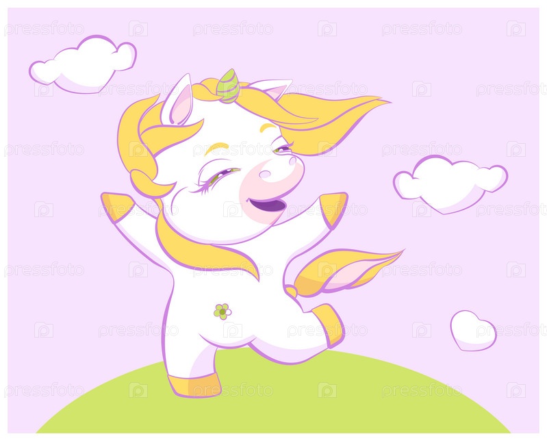 Милый маленький единорог скачет по полю