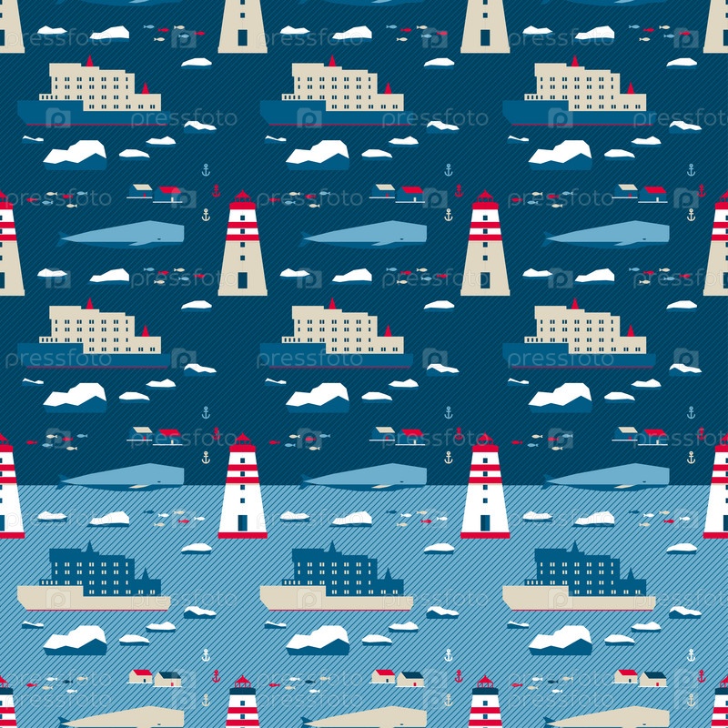 Векторный бесшовный узор в скандинавском стиле. Кит и маяк