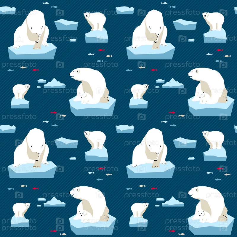 Векторный бесшовный рисунок белых медведей и рыб на Изберге на темно-синем фоне
