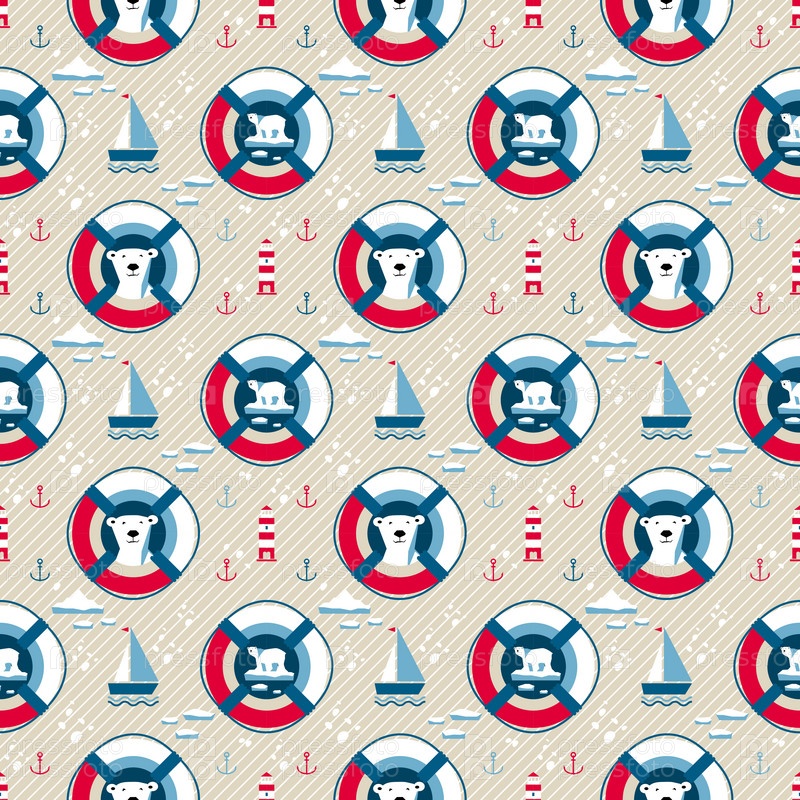 Векторный бесшовный рисунок с белым медведем и спасательным кругом на бежевом фоне