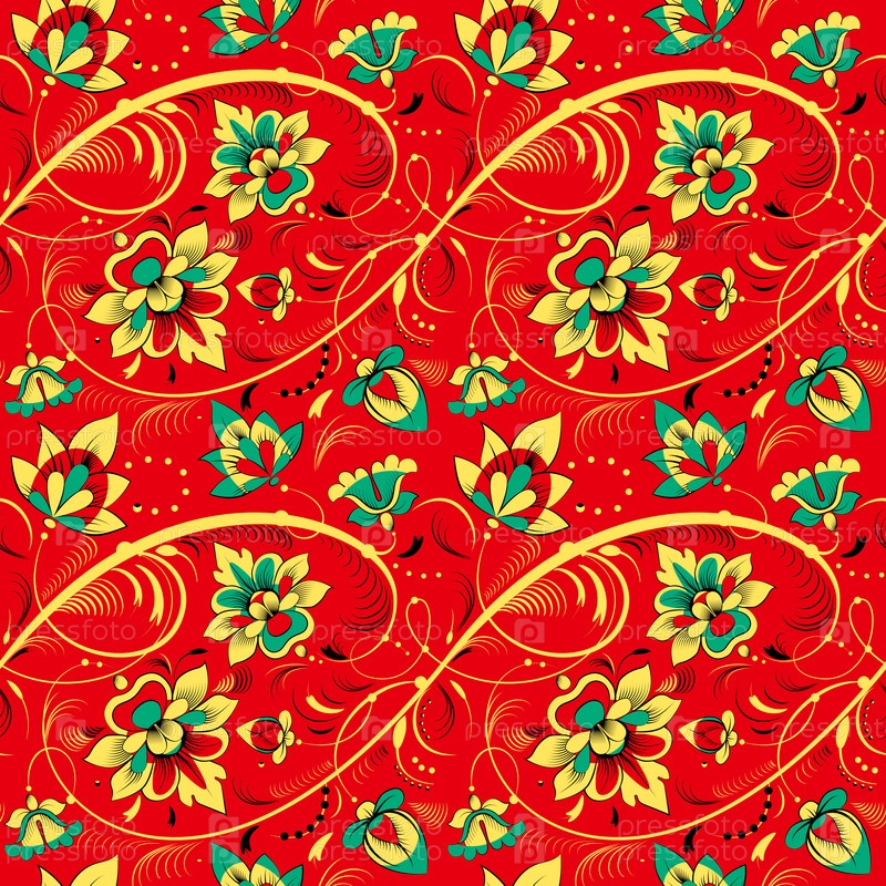 Цветочный векторный бесшовный узор в стиле русской Хохломы, красный фон