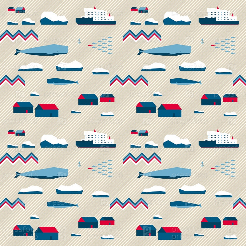 Векторный бесшовный узор в скандинавском стиле. Деревня и киты на бежевом фоне