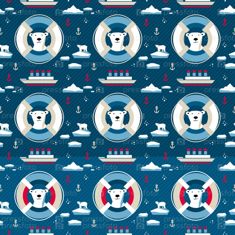 Векторный бесшовный рисунок с белым медведем и спасательным кругом на темно-синем фоне