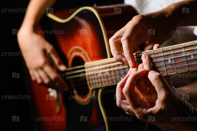 Крупный план обучения игре на гитаре. Руки преподавателя показывают ученику, как работать рукой на грифе гитары. Селективный фокус на руках