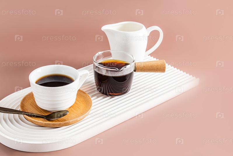 Маленькая чашка утреннего кофе эспрессо на подносе в виде арки с джезвой со свежесваренным кофе и кувшином молока. Передний план