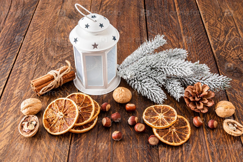 Рождественский фонарь стоит на деревянном деревенском столе среди ломтиков сушеных апельсинов, орехов, шишек, палочек корицы. Новогодний натюрморт