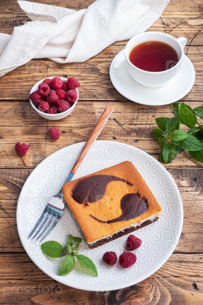 Кусок двухслойного торта на тарелке шоколадных пирожных и творожного чизкейка с малиной. копировать пространство