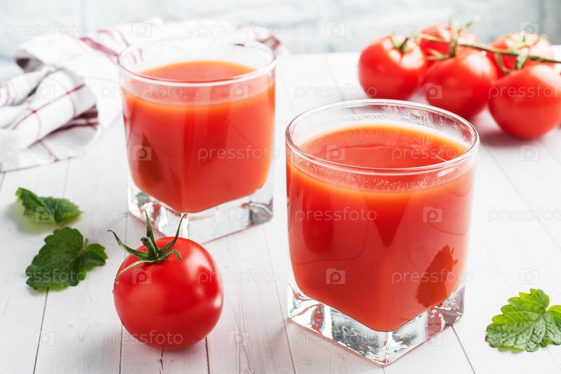 Томатный сок в стеклянных стаканах и свежие спелые помидоры на ветке. Белый деревянный фон с копировальным пространством