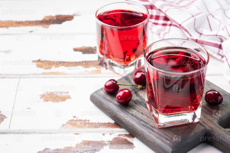 Вишневый сок в стеклянных стаканах со свежими ягодами вишни. Белый фон. скопировать пространство