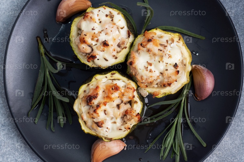 На тарелке запеченные фаршированные столбики кабачков с куриным фаршем и овощами. Серый бетонный фон