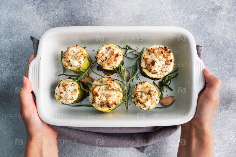 Запеченные фаршированные столбики кабачков с куриным фаршем и овощами в керамической форме для запекания