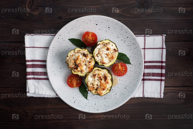 На тарелке запеченные фаршированные столбики кабачков с куриным фаршем и овощами. Темный деревянный фон. Копирование пространства