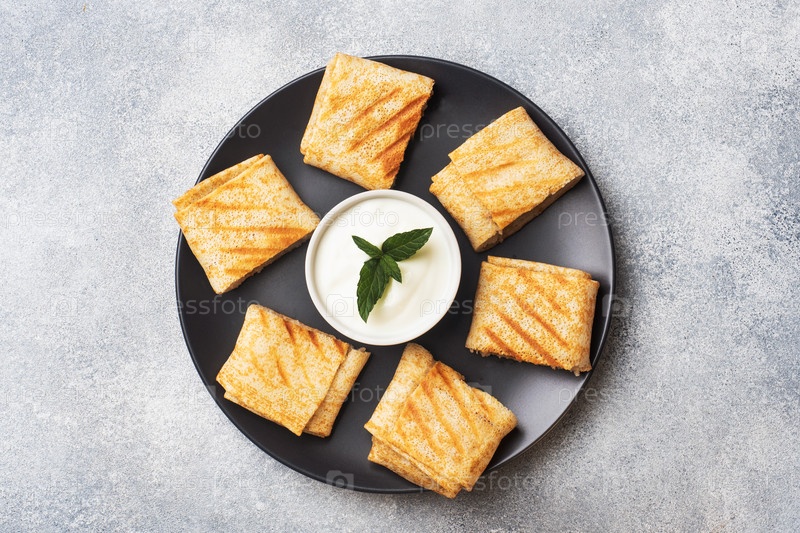 Тонкие блины с начинкой, свернутые в рулеты, жарятся на черной тарелке. Сливочный соус с листьями мяты. Копировать пространство