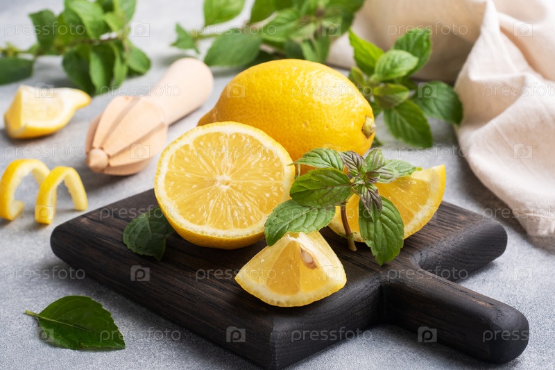 Сочные желтые лимоны целиком и нарезанные листьями свежей мяты на деревянной подставке. Крупным планом