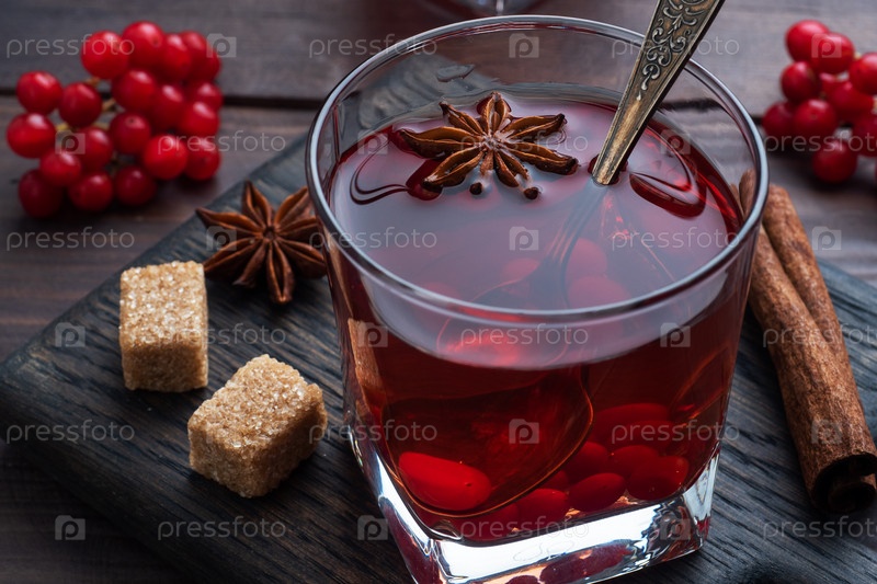 Напиток из ягод калины красной в стеклянной чашке. Ягодный компот с витамином С против простуды