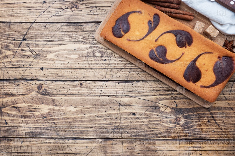 Двухслойный торт на тарелке шоколадных пирожных и творожного чизкейка на деревянном фоне