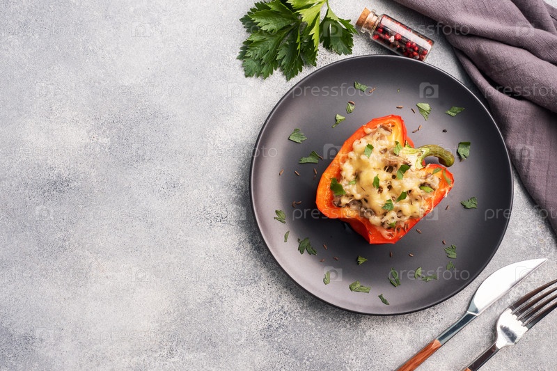 Фаршированный сладкий перец с рисовыми грибами и сыром с зеленью. Запеченные половинки красного перца с начинкой. Серый бетонный фон. Копирование пространства,