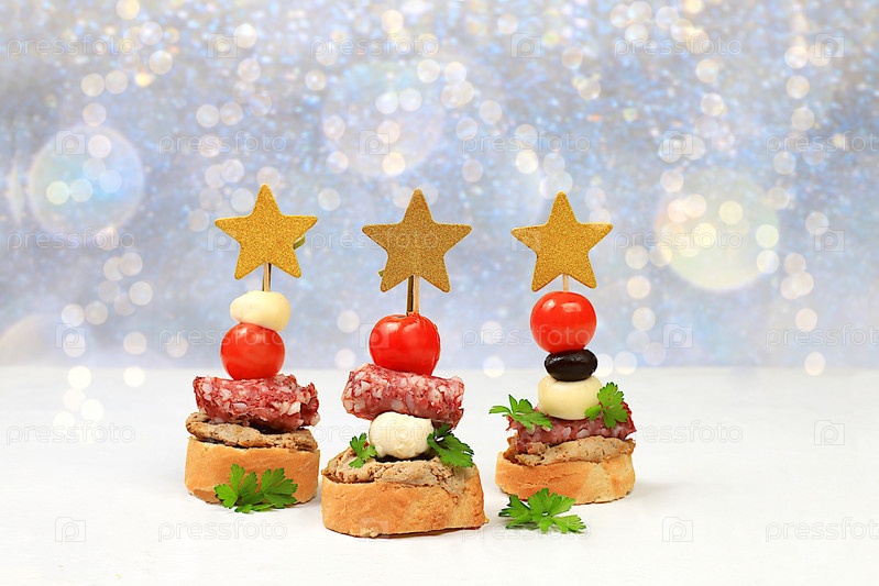 Рождественские и новогодние блюда, набор закусок для праздничного стола. Канапе из помидоров, паштета, сыра моцарелла, салями, оливок, черных оливок и винограда на мраморном столе, выборочный фокус