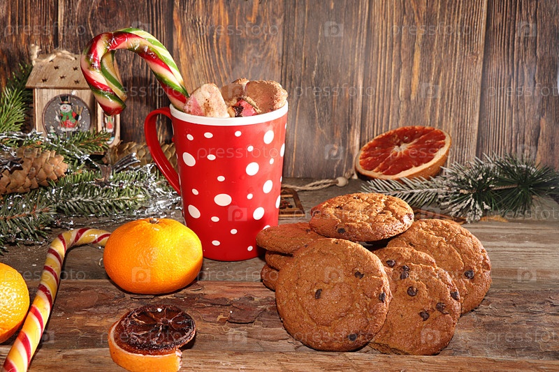 Рождественский и новогодний фон с елками, какао с зефиром и овсяным печеньем на старом деревянном фоне, вид сверху, плоская планировка. Новогодняя открытка для поздравлений, выборочный фокус, баннер,