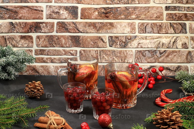 Крепкий алкогольный или безалкогольный коктейль с клюквой, яблоком, апельсином и корицей, глинтвейн, согревающий зимний напиток в холодное время года, рождественский праздничный грог, зимняя композиция, избирательный фокус
