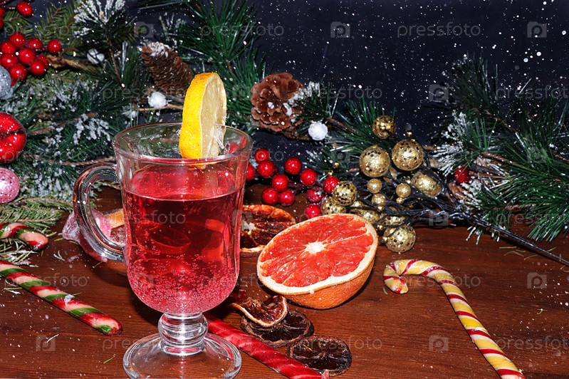 Рождественский горячий глинтвейн с лимоном и корицей на праздничном деревянном столе. Рождественские заготовки с подарками, сладостями и игрушками, елочными ветками, рождественским фоном, атмосферой зимнего праздника