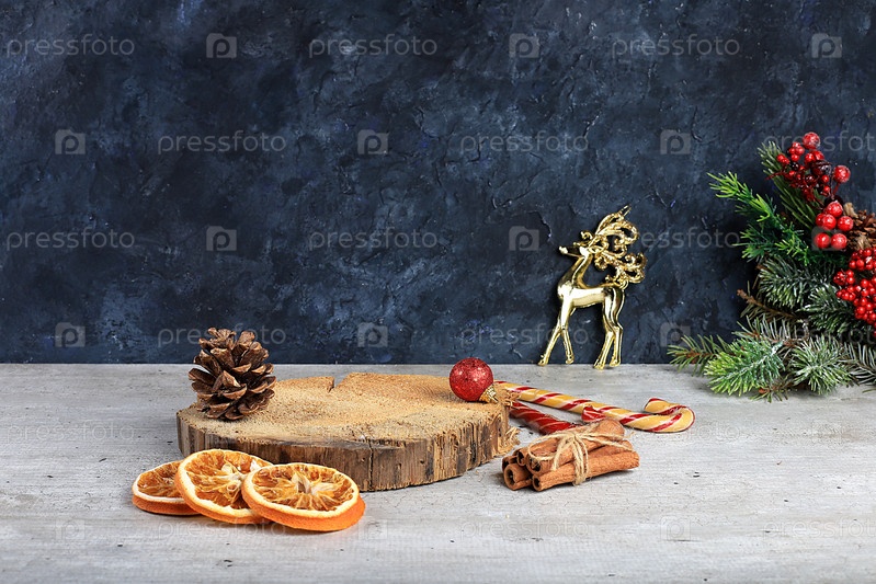 Рождественский и новогодний макет для дизайна и витрины продукции, пустой деревенский стол с деревянными подставками и праздничными украшениями. абстрактная рождественская концепция, выборочный фокус