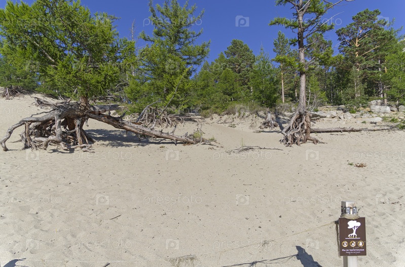 Памятник природы - ходульные деревья. Результат выветривания почвы. Бухта Песчаная, Большая Байкальская тропа. Озеро Байкал. Иркутская область, Россия. Август